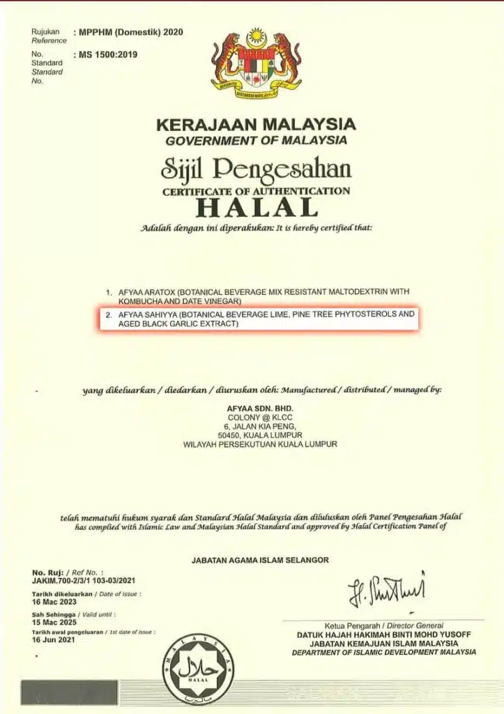 Pengiktirafan tertinggi dalam industri halal, menandakan komitmen Afyaa terhadap standard halal yang ketat dan berkualiti.
