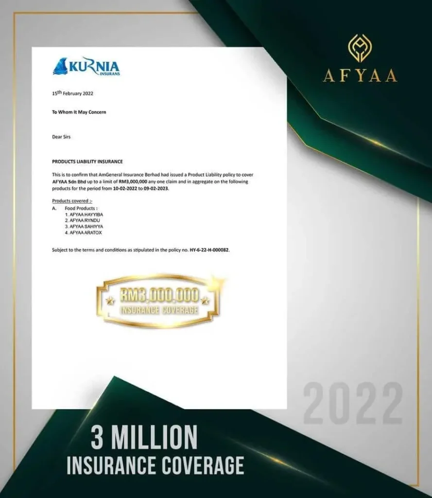 Jangan risau, pihak AFYAA telah menawarkan perlindungan insurans sebanyak RM3 JUTA sekiranya pengguna mengalami kesan sampingan setelah mengamalkan AFYAA Sahiyya.