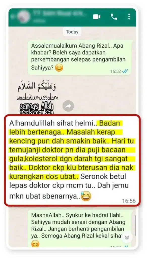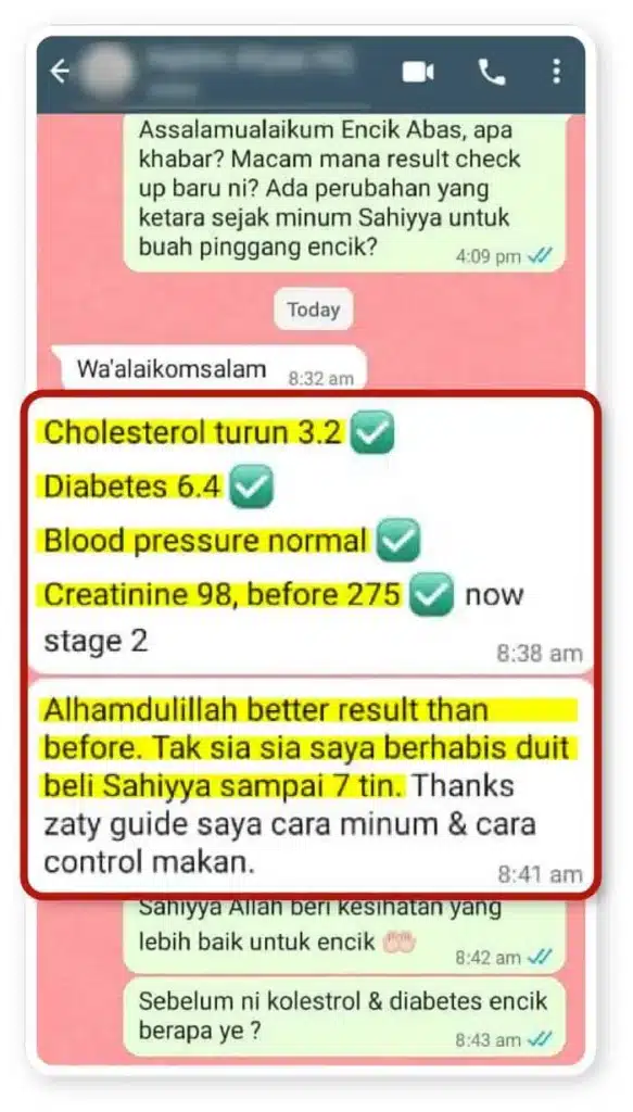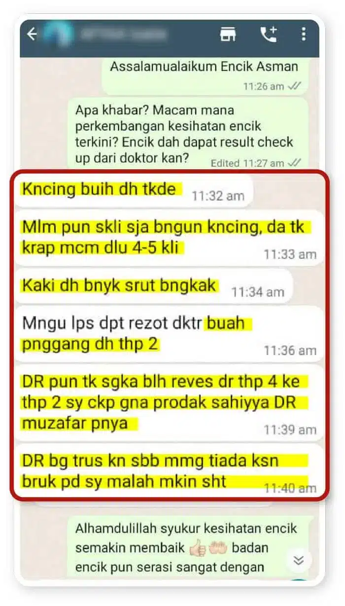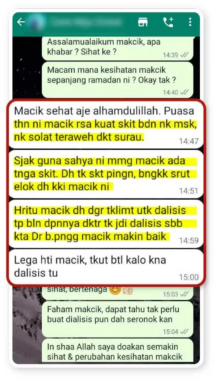 “Alhamdulillah, selepas amalkan selama sebulan, buah pinggang dari tahap 4, sekarang dah jadi tahap 2 je.. Kaki pon dah tak bengkak dan saya semakin bertenaga “
