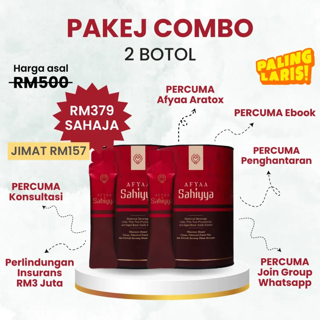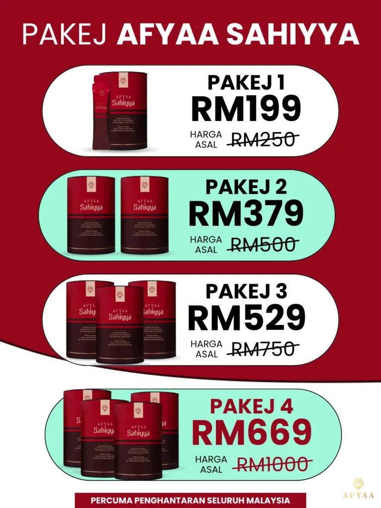 A: Kami menawarkan pakej pada harga istimewa. 1 botol hanya RM199. 2 botol hanya RM379. Anda boleh rujuk senarai harga dan pakej disini: